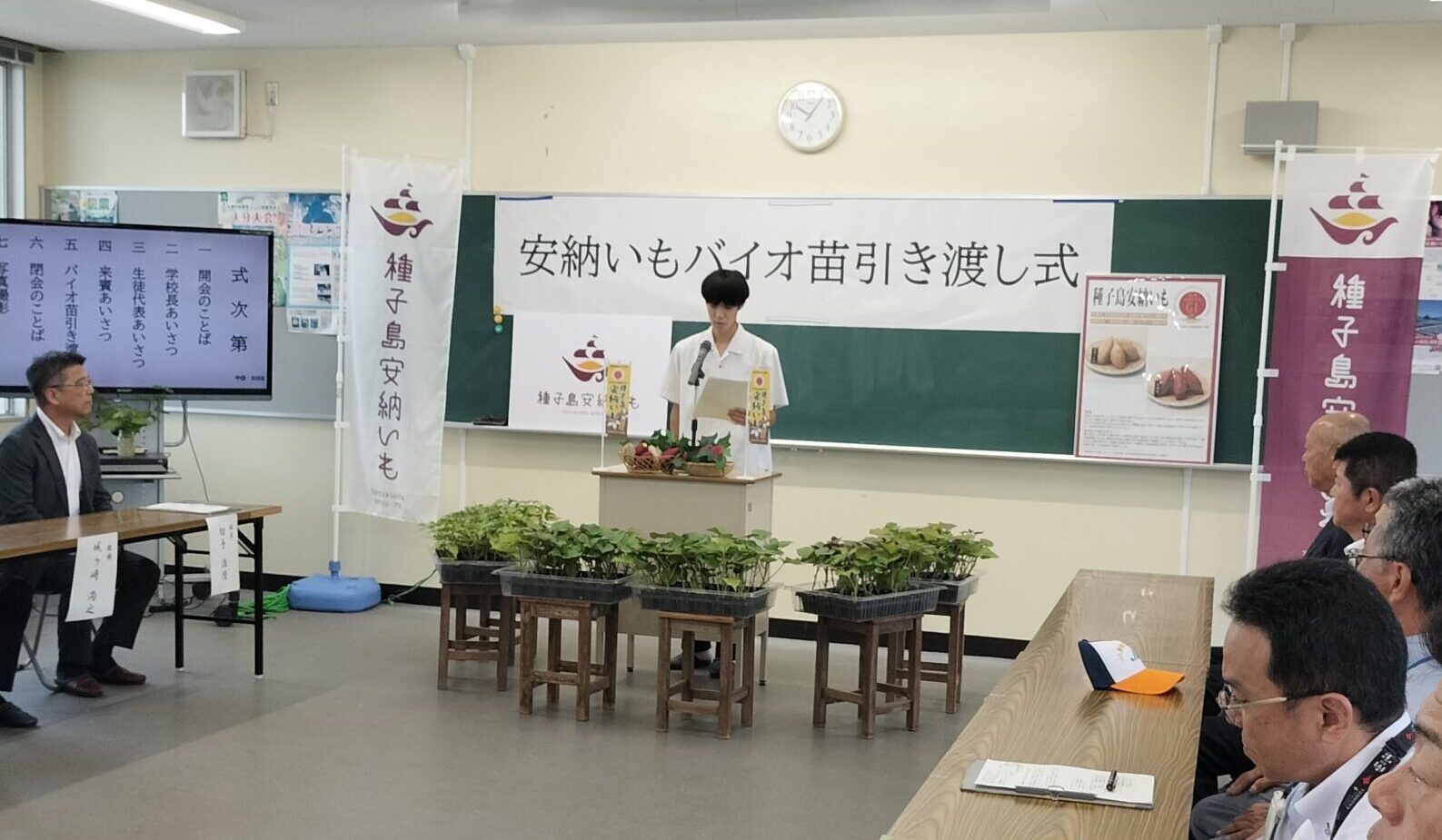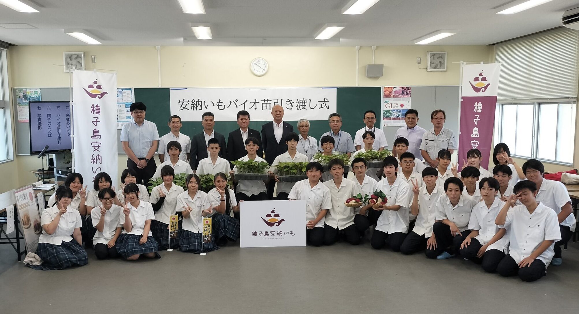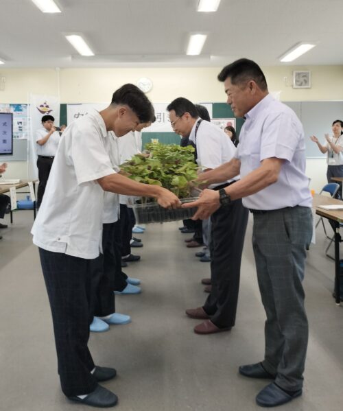 7月8日(火)に種子島高校でバイオ苗引渡式が行われました。この引き渡された苗が、それぞれの市町の施設で増殖され生産者の元へ届けられます。種子島安納いものはじまりは島の高校生たちが担っています。