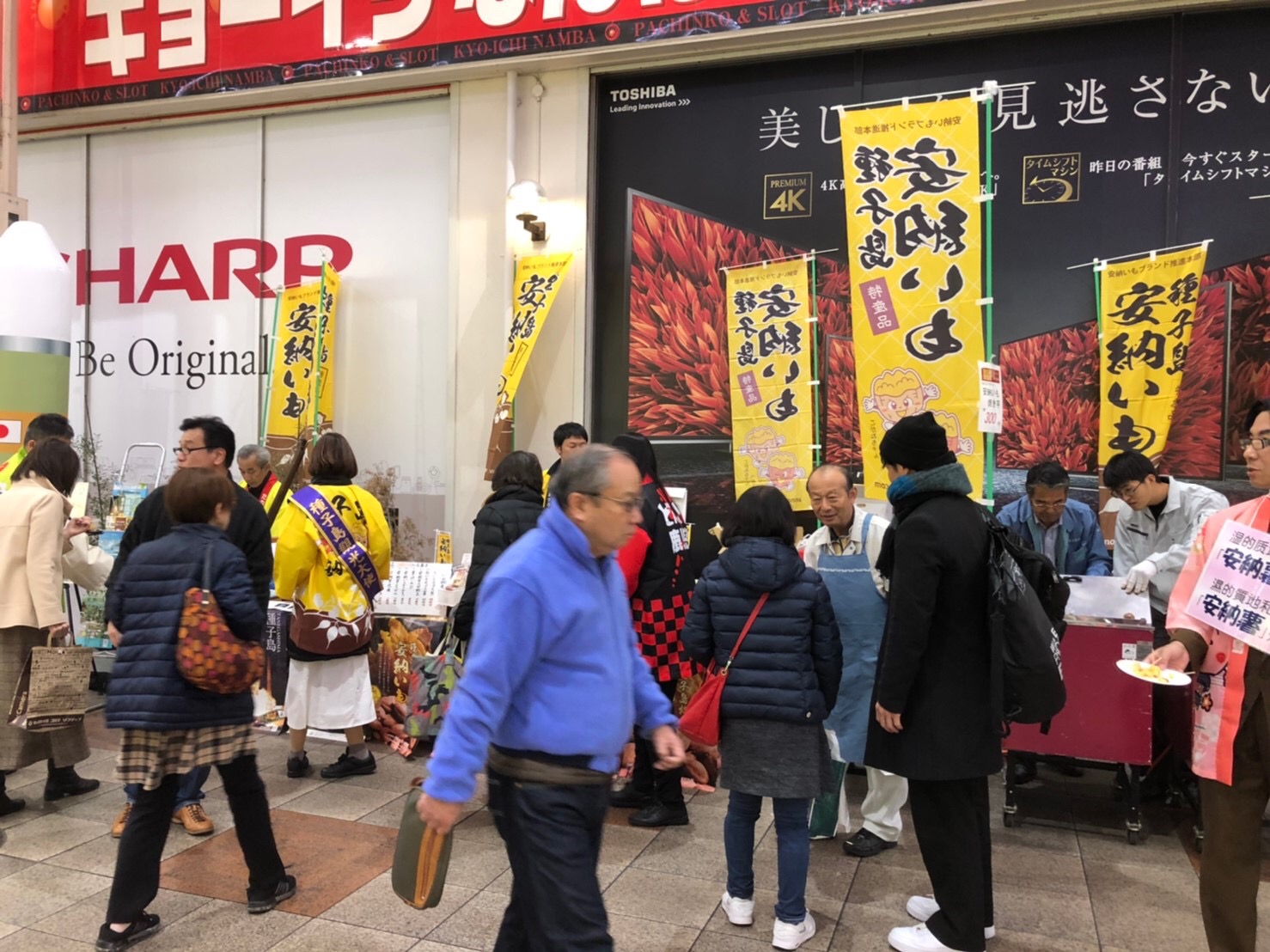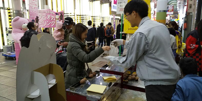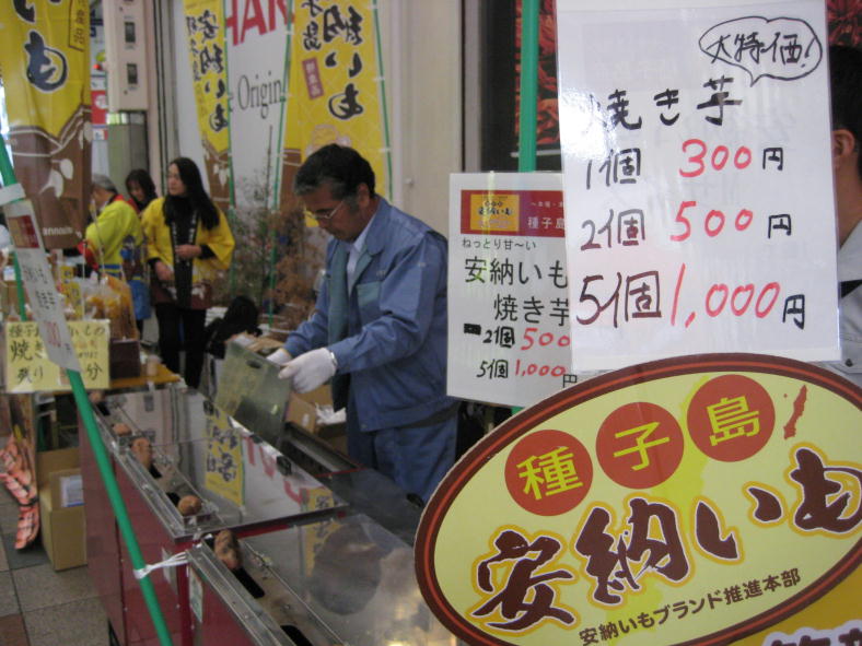 安納いもブランド推進本部では、12月7日~8日の二日間、大阪市難波センター街商店街にて開催されました「全国ふるさと物産市&観光PR」に種子島観光協会、西之表市水産振興協議会と合同で参加し、安納いもの焼き芋・青果用芋・加工品を販売してきました。