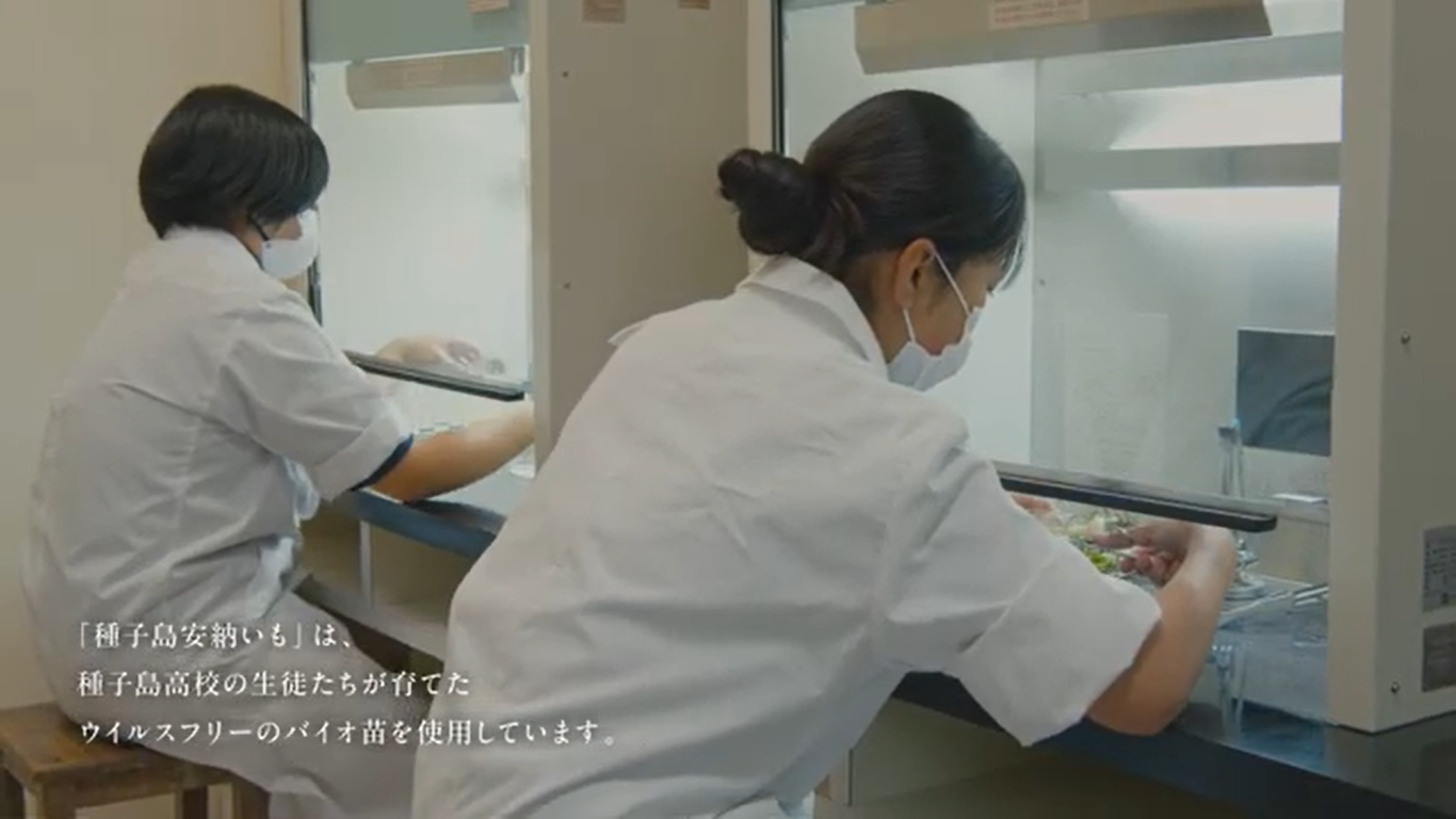 撮影は延期に延期を重ねた12月1日。日ごとに変わる天気予報に翻弄されながらのラストチャンス。水平線から丸い太陽が昇る中での撮影となりました。オープニングはバイオ苗に携わる種子島高校の生徒さんの通学風景です。種子島では日常の、島外の人からは非日常の風景です。是非ご覧になってください。種子島安納いもという「島の宝」を産地一体となって支えている内容となっています。